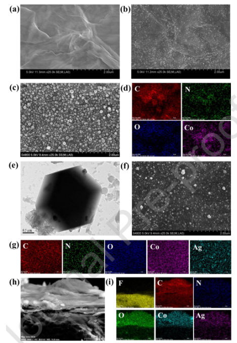 +/GO膜和(c)ZG-5-2膜表面的SEM圖像,以及(d)C、N、O和Co元素的mapping圖像。Ag