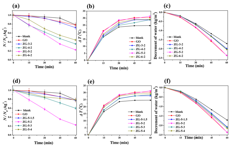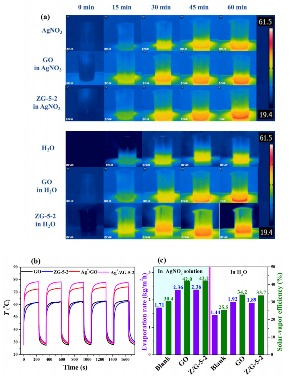 +離子在ZIF-67晶體上的吸附和光還原導(dǎo)致Ag納米顆粒在膜表面沉積,從而促進了可見光的捕獲,抑制了電子離子的復(fù)合,空穴對促進了光熱效應(yīng)。同時,GO襯底上高效率的光熱轉(zhuǎn)化實現(xiàn)了水的蒸發(fā),而濃縮了Ag
