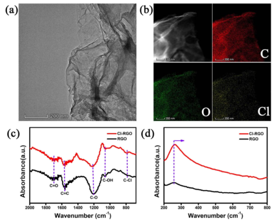 Figure 1.(a)Cl-RGO的TEM圖像。(b)Cl-RGO樣品中C-(紅色),O(綠色)和Cl(黃色)的TEM EDS元素映射。(c)RGO和Cl-RGO的FT-IR光譜。(d)RGO和Cl-RGO的紫外可見光譜。