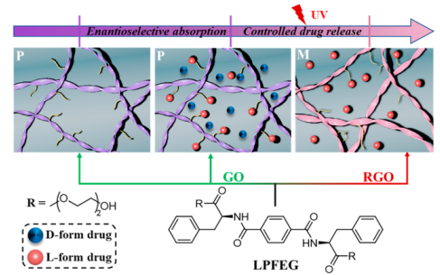 這里,介紹了一種超分子水凝膠,其中氧化石墨烯(GO)摻入會導(dǎo)致紫外線照射下Lphenylalanine衍生物(LPFEG)的逆轉(zhuǎn)螺旋。膠凝劑可調(diào)節(jié)堆積程度,有助于GO表面右手納米纖維的初始構(gòu)造,以及GO還原引起RGO表面螺旋性變化。具體而言,LPFEG顯示了右手和左手納米纖維的混合物,并適當(dāng)暴露于紫外線。在超分子組裝體中還發(fā)現(xiàn)了手性的熱可逆轉(zhuǎn)變,從而實現(xiàn)了動態(tài)和可逆的加熱和冷卻時螺旋性翻轉(zhuǎn)。形貌的轉(zhuǎn)換使該雜化物成為理想候選者,應(yīng)用于精確控制的藥物輸送過程。驚喜的是,它還可以用作光敏劑和選擇性吸收特定的手性藥物的載體(左旋多巴和S-萘普生鈉),并且由于光輻照引起的螺旋反轉(zhuǎn),還顯示出按需釋放的藥物。該研究結(jié)果說明了表面反應(yīng)性如何引導(dǎo)吸附纖維的螺旋結(jié)構(gòu)變化,進(jìn)而控制手性藥物對映異構(gòu)體的選擇性吸收。