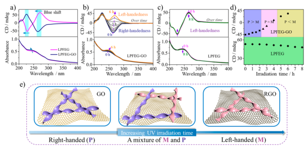 Figure 2.(a)LPFEG和LPFEG-GO水凝膠的CD和相應(yīng)的UV-vis光譜。(b)LPFEG-GO和(c)LPFEG水凝膠的紫外線輻射相關(guān)的CD及其相應(yīng)的紫外線吸收光譜變化。(d)LPFEG和LPFEG-GO水凝膠的CD強(qiáng)度圖。(e)隨著紫外線照射時間增加,從右手納米纖維轉(zhuǎn)變?yōu)樽笫掷w維的代表性階段。