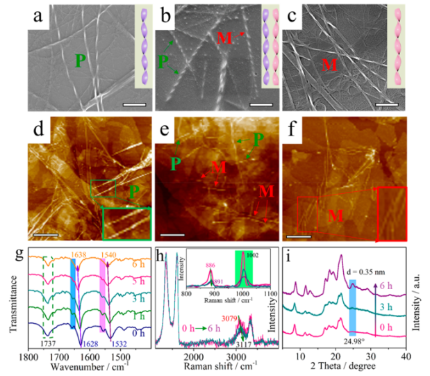 Figure 3.(a-c)LPFEG-GO干凝膠在不同的紫外線照射時間下的SEM圖像,(d)GO表面,(e)部分還原的GO表面和(f)RGO表面上組裝的LPFEG干凝膠的原子力顯微鏡圖像。LPFEG-GO干凝膠在不同輻照時間的(g)FTIR,(h)拉曼光譜和(i)XRD譜。