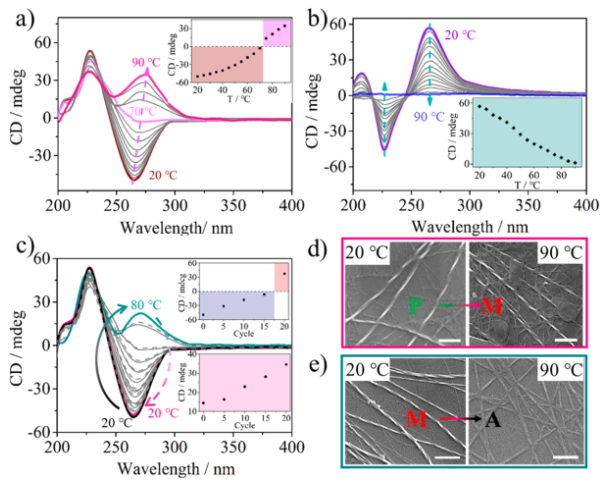 Figure 4. (a)LPFEG-GO和(b)LPFEG水凝膠的CD信號隨溫度的變化情況(20至90°C范圍內(nèi))。(c)LPFEG-GO水凝膠的CD光譜隨循環(huán)溫度的變化情況。不同條件下(d) LPFEG-GO和(e) LPFEG干凝膠的SEM圖。