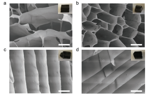 Figure 1. 在不同pH值下,由TOCN/GO混合溶膠制備得晶膠的SEM截面照片。 a)CG-TOCN/GO-4.0, b)CGTOCN/GO-5.2, c)CG-TOCN/GO-6.4, d)CG-TOCN/GO-10.4。每個(gè)面板中的插圖是相應(yīng)晶膠的光學(xué)圖像。
