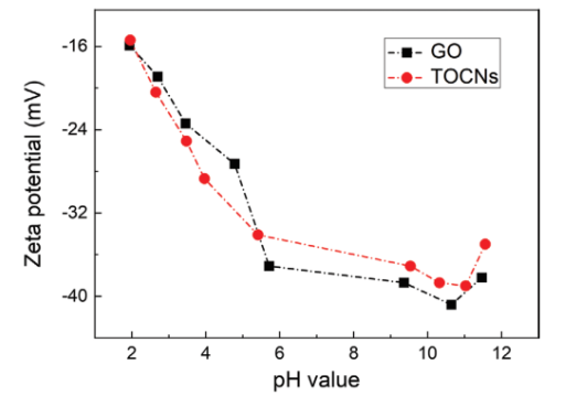 Figure 2. TOCN和GO中pH相關(guān)的Zeta電位變化。