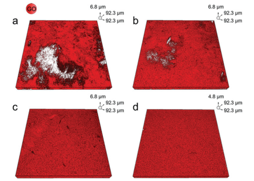 Figure 3. 在不同pH值下,TOCN/GO混合溶膠微結(jié)構(gòu)的3D激光掃描共聚焦圖像。a)MS-TOCN/GO-4.0。b)MS-TOCN/GO-5.2。c)MS-TOCN/GO-6.4。d)MS-TOCN/GO-10.4。在這些圖像中,紅色區(qū)域代表GO,而TOCN纖維被標(biāo)記為透明。