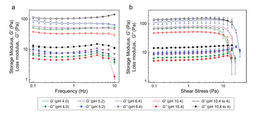 Figure 4. 不同pH值下TOCN/GO混合溶膠的流變特性。a)頻率掃描和b)剪切應(yīng)力掃描測試。