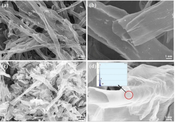 Figure 1. (a,b)CMT和(c,d)CMT@N-RGO在不同放大倍數(shù)下的SEM圖像。(d)插圖是CMT@NRGO的EDS。