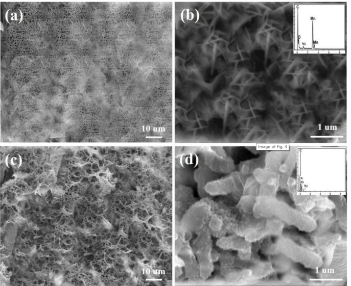 2納米壁和(c,d)CMT@N-RGO/PANI納米棒在不同放大倍數(shù)下的SEM圖像。圖(b,d)所示的插圖分別是CMT@N-RGO/MnO
