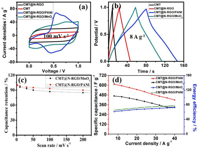 2和CMT@N-RGO/PANI在不同的掃描速率和電流密度下的(a)CV曲線,(b)GCD曲線,(c)電容保持率和(d)比電容和能效的比較。