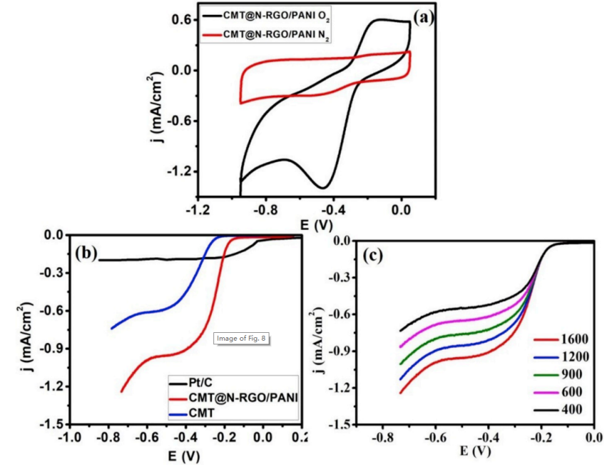 2飽和KOH溶液(0.1 M)中測(cè)試的CV曲線。(b)Pt/C,CMT和CMT@N-RGO/PANI的極化曲線的比較。(c)在不同轉(zhuǎn)速下,CMT@N-RGO/PANI的極化曲線。