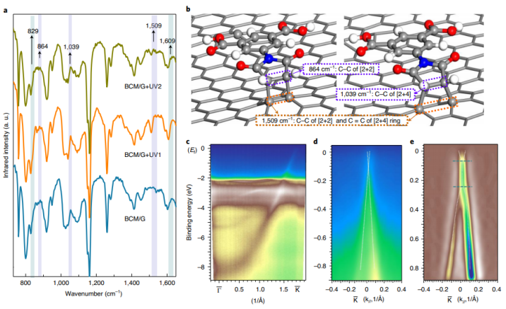 3雜化的化學(xué)反應(yīng)已被證明是一種吸引人但又具有挑戰(zhàn)性的使石墨烯功能化途徑。迄今為止,還不可能在原子/分子尺度上精確地控制反應(yīng)位點(diǎn)或其側(cè)向順序。對(duì)于需要長(zhǎng)時(shí)間浸泡,加熱,電脈沖或探針按壓的反應(yīng),其應(yīng)用前景受到限制。在這里,我們演示了二維分子網(wǎng)絡(luò)的空間選擇性光環(huán)加成反應(yīng),該二維分子網(wǎng)絡(luò)具有無(wú)缺陷的單層石墨烯基面。在亞分子水平上可以直接觀察到,加成是由超高真空中的紫外線照射觸發(fā)的,不需要借助石墨烯的莫爾圖案。該反應(yīng)涉及[2+2]和[2+4]環(huán)加成反應(yīng),反應(yīng)位點(diǎn)排列成二維擴(kuò)展且排列有序的陣列,從而為反應(yīng)后的石墨烯層產(chǎn)生帶隙。該工作為石墨烯光電微電子器件的設(shè)計(jì)和工程提供了堅(jiān)實(shí)的基礎(chǔ)。