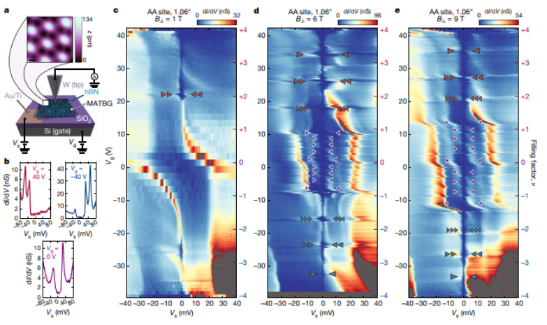 電子與其能帶拓?fù)渲g的相互作用會產(chǎn)生物質(zhì)的異常量子相。大多數(shù)拓?fù)潆娮酉喑霈F(xiàn)在電子與電子相互作用較弱的系統(tǒng)中。僅由于強(qiáng)相互作用而出現(xiàn)拓?fù)潆A段的情況很少見,并且大多局限于在強(qiáng)磁場中實(shí)現(xiàn)的情況。在魔角扭曲雙層石墨烯(MATBG)中發(fā)現(xiàn)具有拓?fù)涮卣鞯闹倦娮訋?,為尋找?qiáng)相關(guān)的拓?fù)潆A段創(chuàng)造了獨(dú)特的機(jī)會。在此,我們通過掃描隧道電子顯微鏡中引入局部光譜表征技術(shù),發(fā)現(xiàn)在MATBG材料中Chern number為C=±1, ±2, ±3時(shí),分別在單位晶格中形成填充因子為±3, ±2, ±1表現(xiàn)的一系列拓?fù)浣^緣態(tài),并且這種拓?fù)湎嗤ㄟ^強(qiáng)度適中的磁場穩(wěn)定。這里檢測到的一個(gè)相(C = +1)是此前觀察到的,當(dāng)六方氮化硼襯底故意打破MATBG的亞晶格對稱性時(shí),相互作用具有次要作用。我們證明,強(qiáng)的電子-電子相互作用不僅可以產(chǎn)生先前觀察到的相,而且還可以在MATBG中產(chǎn)生未預(yù)料的Chern絕緣相。通過假定強(qiáng)相關(guān)性有助于打破時(shí)間反轉(zhuǎn)對稱性來形成由弱磁場穩(wěn)定的Chern絕緣子,可以來理解我們觀察到的全部相序。我們的發(fā)現(xiàn)表明,多體關(guān)聯(lián)可以在莫爾系統(tǒng)中創(chuàng)建拓?fù)潆A段,這超出了弱相互作用模型所預(yù)期的階段。