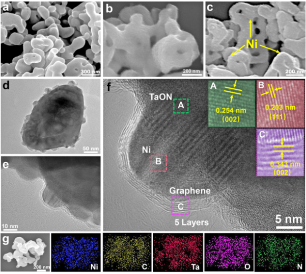 Figure 2.(a)原始TaON,(b)TaON@Ni(OH)2-2和(c)TaON@Ni@ G-2雜化物的SEM圖像。(d,e)TaON@Ni@G-2雜化物的TEM和(f)HRTEM圖像。(g)TaON@Ni@G-2雜化體的SEM圖像和相應(yīng)的EDX元素映射圖像。