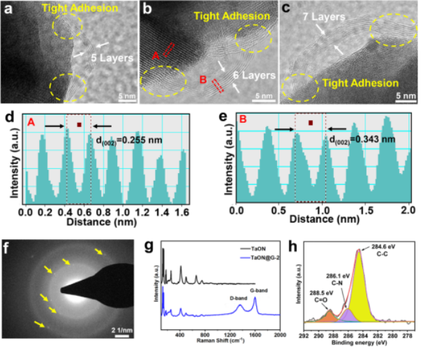 Figure 3. (a-c)TaON@G-2的TEM圖像。(d,e)線掃強(qiáng)度分布圖。(f)石墨烯的SAED模式。(g)TaON和TaON@G-2雜化物的拉曼光譜。(h)TaON@G-2雜化物的C 1s XPS光譜。