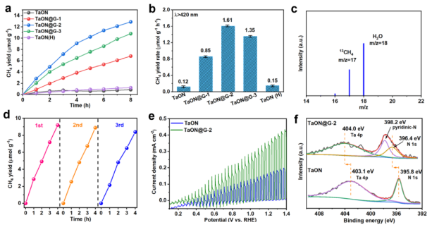 Figure 4.(a)CH4產(chǎn)量隨可見光照射時間而變化,(b)各種基于TaON的光催化劑的CH4析出速率。(c)13CO2同位素實驗獲得13CH4的GC-MS結(jié)果。(d)循環(huán)曲線。(e)TaON和TaON@G-2光電電極的電流-電位曲線。(f)TaON和TaON@G-2的N 1s和Ta 4p XPS光譜。