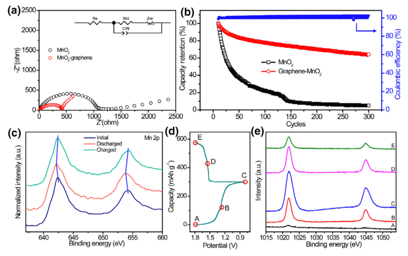 2-石墨烯電極的充放電曲線。(b)CV曲線;(c)在MnO