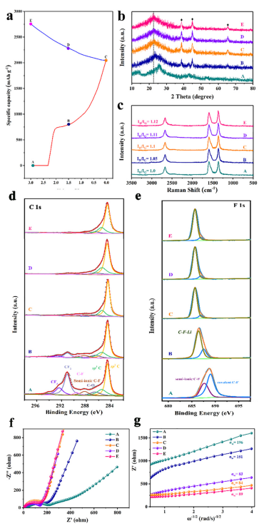 Figure 3. (a)F-改性石墨烯在初始階段的充放電曲線。F-改性石墨烯在五個(gè)狀態(tài)下的(b)異位XRD、(c)異位拉曼光譜、(d)C 1s和(e)F 1s的異位XPS光譜、(f)原位EIS光譜和(g)阻抗關(guān)系圖