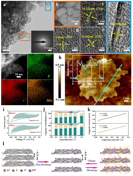 Figure 4. (a)和(b)循環(huán)后F-改性石墨烯的TEM圖像。循環(huán)后LiF納米顆粒(c-e)和石墨烯(f)區(qū)域的HRTEM。(g)STEM和相應(yīng)的EDX元素映射。(h)循環(huán)后F改性石墨烯的AFM。(i)循環(huán)之前和之后,F(xiàn)修飾石墨烯電極的伏安響應(yīng)。(j)循環(huán)前后擴(kuò)散和電容容量的貢獻(xiàn)率。(k)峰值電流與掃描速率的對(duì)數(shù)圖。(l)LiF納米顆粒發(fā)泡對(duì)Li