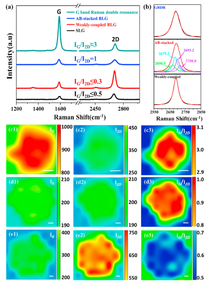 Figure 1. CVD獲得的雙層石墨烯(BLG)的拉曼表征。(a)具有不同堆疊方向的單層石墨烯(SLG)和BLG的拉曼光譜。(b)BLG二維帶的洛倫茲曲線擬合。(c1-c3)、(d1-d3)和(e1-e3)在傳統(tǒng)傳輸后,GRDR-BLG、AB堆疊的BLG和WC-BLG的I
