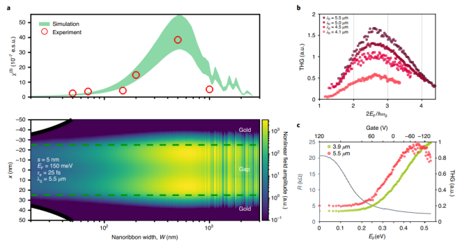 非線性納米光子學(xué)是利用工程納米結(jié)構(gòu)將光聚集到小體積中,并且通過(guò)光譜和空間控制增強(qiáng)非線性光學(xué)的過(guò)程。由于石墨烯本身具有明顯的電場(chǎng)調(diào)諧的非線性光學(xué)響應(yīng),在非線性光電應(yīng)用方面具有很大的應(yīng)用前景。在此,我們報(bào)告了石墨烯-絕緣體-金屬異質(zhì)結(jié)構(gòu)中異常強(qiáng)的光學(xué)非線性,與純石墨烯相比,該異質(zhì)結(jié)構(gòu)的三次諧波信號(hào)增強(qiáng)了三個(gè)數(shù)量級(jí)。此外,通過(guò)外部柵壓,可增加石墨烯費(fèi)米能量,發(fā)現(xiàn)石墨烯等離子體激元激發(fā)了光學(xué)非線性并調(diào)制了三次諧波信號(hào)。研究結(jié)果表明,石墨烯-絕緣體-金屬是一種有前途的異質(zhì)結(jié)構(gòu),可用于光學(xué)控制和電可調(diào)的納米光電組件。