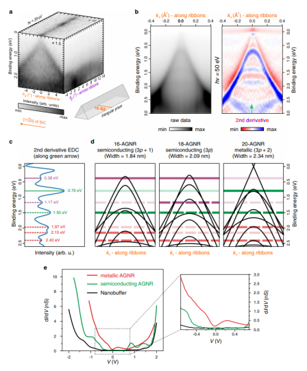由于缺乏電子帶隙,常規(guī)石墨烯無法實現(xiàn)邏輯電子學(xué)中的關(guān)閉狀態(tài)。因此,這種特性使得石墨烯一直無法用于下一代場效應(yīng)晶體管。在這項工作中,我們在6H-SiC臺面結(jié)構(gòu)的側(cè)壁上生長了高質(zhì)量的扶手式石墨烯納米帶。角分辨光電子能譜(ARPES)和掃描隧道能譜測量揭示了由量子受限效應(yīng)驅(qū)動的具有寬度依賴性的半導(dǎo)體帶隙的發(fā)展。此外,ARPES展示了基于石墨烯環(huán)境中實現(xiàn)的理想的一維電子行為,包括分辨良好的子帶組成,沿著和跨越納米帶分別表現(xiàn)為色散和非色散。我們的實驗結(jié)果與緊束縛計算相結(jié)合,為更深入地探索量子受限現(xiàn)象奠定了基礎(chǔ),并為新型低功耗電子技術(shù)開辟了有趣的途徑。