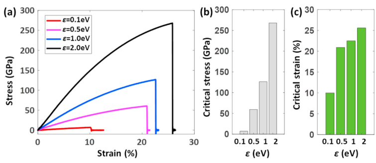 Figure 5. (a)應(yīng)力-應(yīng)變曲線;在SW勢(shì)中具有不同ε的Gr拉伸模擬的(b)臨界應(yīng)力和(c)臨界應(yīng)變。