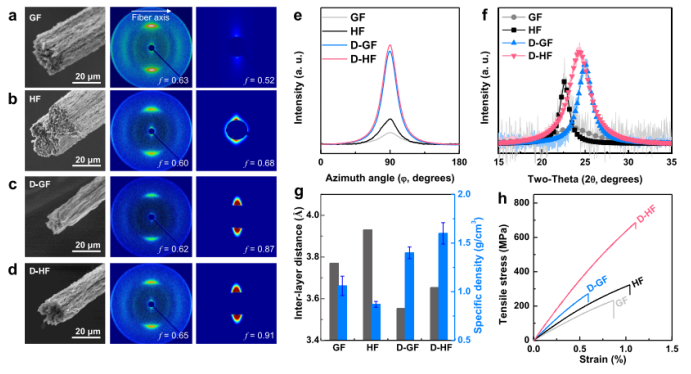 Figure 2. 高度定向且緊密集成的纖維結(jié)構(gòu)。a rGO纖維(GF),b混合纖維(HF), c rGO纖維(D-GF)和d混合纖維(D-HF)的WAXS和SAXS模式。e方位角圖表示Herman定位因子。f XRD圖顯示層間距離的分布。g層間距離和比密度。h纖維的拉伸應(yīng)力-應(yīng)變曲線。