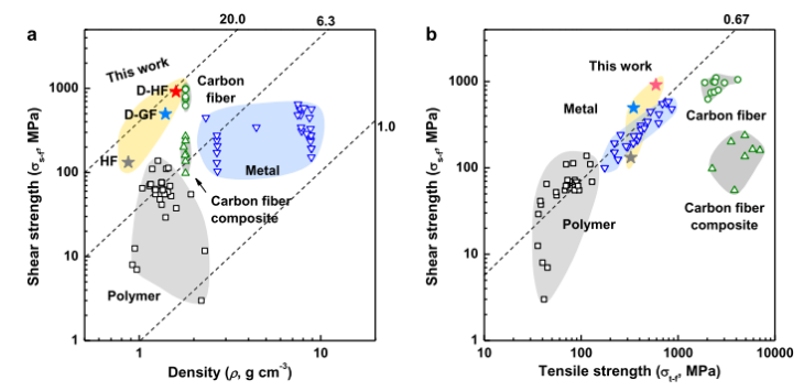 Figure 4. 纖維的機(jī)械強(qiáng)度比較。a剪切破壞強(qiáng)度(σs-f)和密度(ρ)的Ashby圖。 b剪切強(qiáng)度和拉伸強(qiáng)度的Ashby圖。