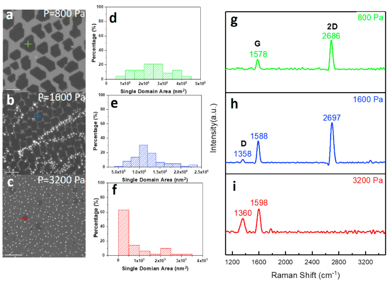 Figure 5. 在不同壓力下,在銅箔上生長的石墨烯的(a-c)SEM圖像,(d-f)統(tǒng)計分析和(g-i)拉曼光譜。比例尺1毫米。