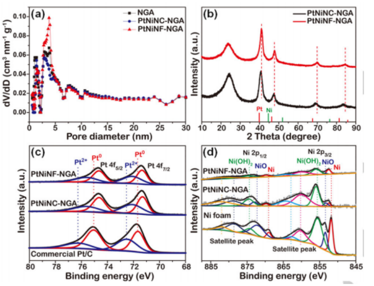 Figure 2 (a) 氮摻雜石墨烯氣凝膠(NGA),PtNi納米晶/氮摻雜石墨烯氣凝膠(PtNiNC-NGA)和PtNi納米框架/氮摻雜石墨烯氣凝膠(PtNiNF-NGA)的孔徑尺寸分布;(b) PtNiNC-NGA和PtNiNF-NGA的XRD圖譜;(c) 商用Pt/C、PtNiNC-NGA和PtNiNF-NGA的Pt 4f XPS圖譜;(d) Ni 2p的XPS圖譜。
