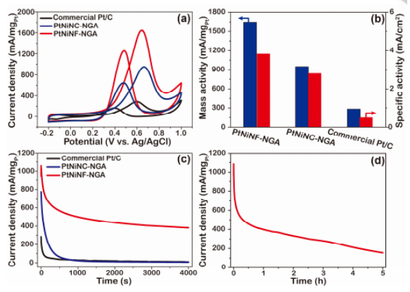 4和1 M甲醇混合溶液中的循環(huán)伏安圖;(b) 商用Pt/C、PtNiNC-NGA和PtNiNF-NGA電催化甲醇氧化的質(zhì)量活性和比活性;(c) 商用Pt/C、PtNiNC-NGA和PtNiNF-NGA 在0.56 V恒電位下的計時安培曲線;(d) PtNiNF-NGA 在0.56 V恒電位下連續(xù)工作5小時的計時安培曲線。