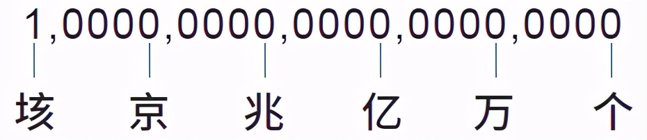 其實(shí),我們祖先的智慧同樣高明,在創(chuàng)造大數(shù)字表達(dá)時也是有節(jié)奏的。在數(shù)字表達(dá)上英文是每3位數(shù)升一個級,中文是每4位數(shù)升一個級。我們祖先創(chuàng)造出表達(dá)數(shù)字的漢字是“個、十、百、千、萬、十萬、百萬、千萬、億、十億、百億、千億、兆、十兆、百兆、千兆、京、十京、百京、千京、垓、十垓、百垓……”。