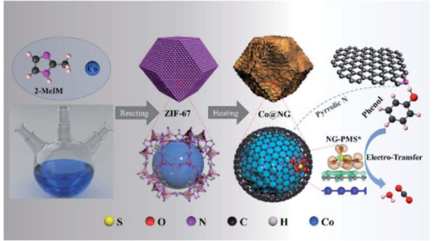 Figure 1. N摻雜石墨烯封裝鈷納米顆粒(Co@NG)的制備路線和模型,具有可控的微觀形貌,以及在Co@NG催化劑上發(fā)生的類Fenton反應機理。