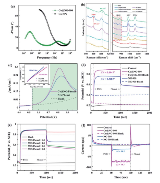 Figure 4.(a)Co@NG-900和Co NP的奈奎斯特圖;(b)局部和全部原位拉曼光譜;(c)Co@NG-900電極的LSV和Tafel斜率;(d)NG-PMS在Co@NG-900和NG-900電極上的開路電勢曲線的變化,和(e)在不同比例時的情況;(f)加入PMS和苯酚后安培i-t曲線測量。