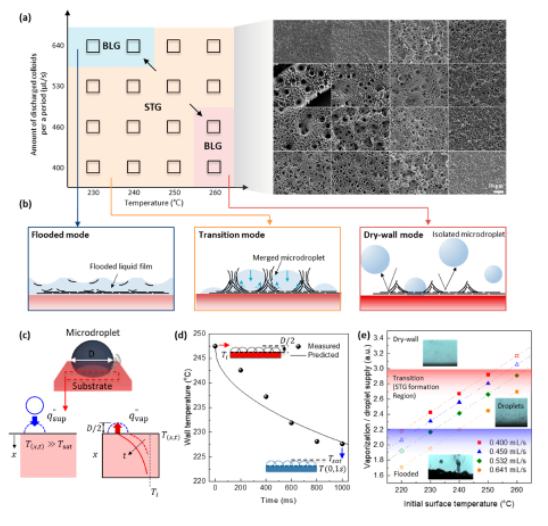 Figure 3. STG形成和熱分析的標準。影響STG形成的因素,包括目標表面的溫度以及在給定時間段內排出的膠體數量,如圖(a)所示。(b)rGO片自組裝機制。(c)微滴汽化供應和汽化熱通量的熱模擬。(d)基板的溫度情況。(e)評估STG形成的實驗條件。