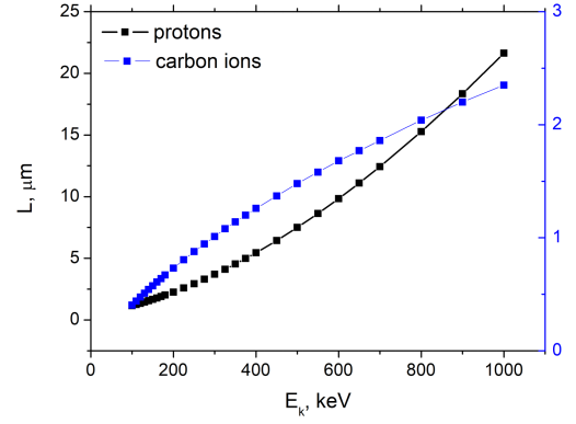 Figure 3. 通過SRIM軟件包計算的PMMA中質(zhì)子(黑色方塊)和碳離子(藍(lán)色方塊)范圍的相關(guān)性。
