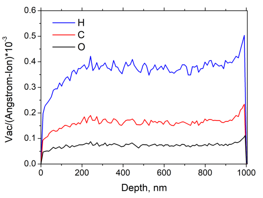 Figure 4. 對地靜止軌道(GEO)(SRIM數(shù)值模擬)上,1 µm厚石墨烯/PMMA雙層質(zhì)子譜的空位分布
