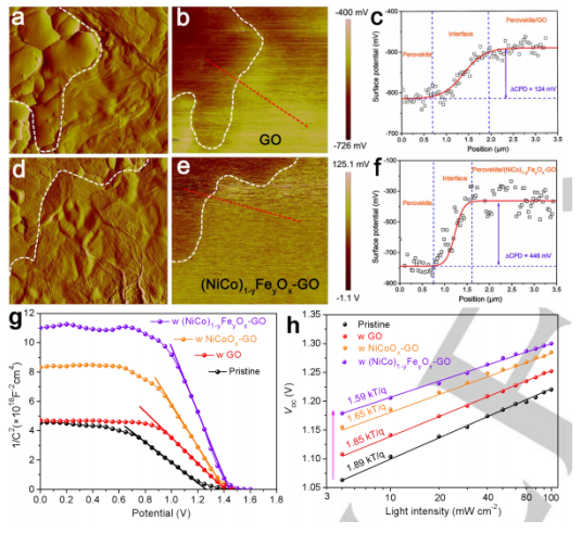 2 PSC的助空穴劑。由于氧化石墨烯由邊緣含氧官能團(tuán)自發(fā)的電子轉(zhuǎn)移誘導(dǎo)p型摻雜到(NiCo)