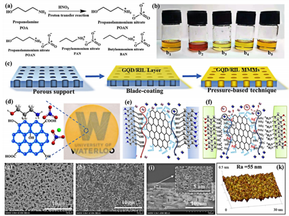 混合基質(zhì)膜(MMMs)實(shí)現(xiàn)高效氣體分離機(jī)遇和挑戰(zhàn)并存。本文以活性離子液體(RIL)為連續(xù)相,以石墨烯量子點(diǎn)(GQD)為納米填充材料,通過分子級(jí)雜化策略構(gòu)筑類混合基質(zhì)膜,實(shí)現(xiàn)了乙烯/乙烷(0.416 nm/ 0.443 nm)的高效分離。在GQD/RIL AMMMs中嵌入少量的GQD (3.5 wt%)后,乙烯的滲透率飆升了3.1倍,乙烯/乙烷的選擇性同時(shí)提高了近60%,達(dá)到99.5,這超過了此前報(bào)道的大多數(shù)最先進(jìn)的膜。重要的是,可視化了界面通路的結(jié)構(gòu),揭示了其自組裝機(jī)制,其中RIL和GQDs之間的非共價(jià)相互作用誘導(dǎo)IL鏈的局部排列自組裝成大量致密、超快的界面通路,實(shí)現(xiàn)了超高通透性和選擇性的結(jié)合。