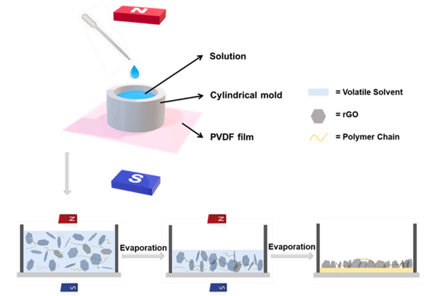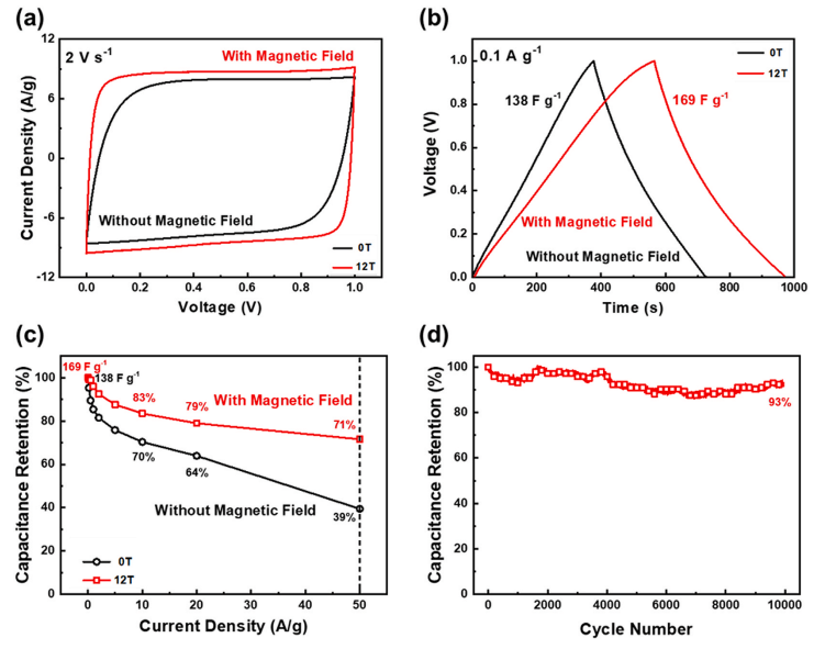 石墨烯已被廣泛用作超級(jí)電容器電極材料。但是,平行堆疊的石墨烯層通常會(huì)導(dǎo)致無效的離子擴(kuò)散和電子轉(zhuǎn)移,這通常會(huì)降低超級(jí)電容器的倍率性能。本研究采用溶劑蒸發(fā)法,以PEDOT:SS為粘合劑,固定取向石墨烯,以良好的導(dǎo)電性以及與石墨烯片的強(qiáng)烈π-π堆疊相互作用固定,制備了還原氧化石墨烯(rGO)和聚(3,4-乙撐二氧噻吩)聚苯乙烯磺酸鹽(PEDOT:PSS)復(fù)合膜。使用掃描電子顯微鏡(SEM)、氮吸附-解吸和小角度X射線散射進(jìn)行的分析表明,盡管施加了磁場(chǎng),但石墨烯片在沒有磁場(chǎng)的情況下隨機(jī)取向,但它們排列良好。作為電容器電極材料,排列整齊的rGO在電流密度為50 A g-1時(shí)顯示出169 F g-1的比電容,電容保持率約為70%,并且在90℃時(shí),其循環(huán)伏安(CV)曲線仍然保持矩形。電壓掃描速率為2 V s−1。對(duì)準(zhǔn)的rGO電極可以幫助突破傳統(tǒng)超級(jí)電容器的局限性,并顯著提高其充電/放電速率和功率密度。