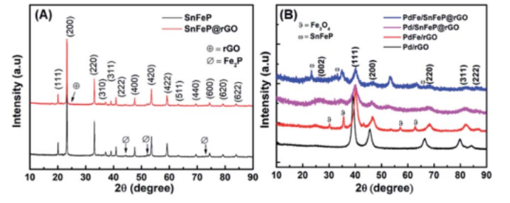 Figure 2. (A)SnFeP和SnFeP@rGO以及(B)合成催化劑的XRD圖。