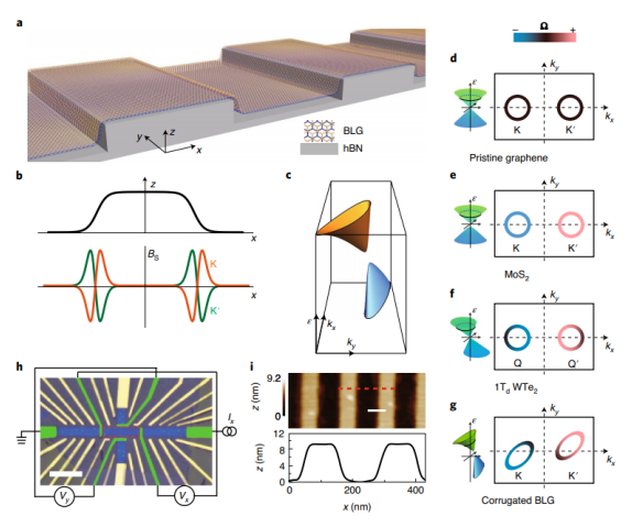 應(yīng)變可用來(lái)改變二維材料的能帶結(jié)構(gòu),從而改變其電子性質(zhì)。然而,目前的研究主要集中在低空間對(duì)稱性的單層石墨烯上,只考慮了實(shí)空間偽磁場(chǎng)。在這里,我們證明了光刻模式應(yīng)變可用于在雙層石墨烯中,創(chuàng)建非平常的能帶結(jié)構(gòu)和異質(zhì)相。該方法創(chuàng)建了人造波紋雙層石墨烯,其中真實(shí)空間和動(dòng)量空間偽磁場(chǎng)(Berry曲率)共存,并具有非平凡特性,例如Berry曲率偶極子。這導(dǎo)致出現(xiàn)兩個(gè)霍爾效應(yīng)而不會(huì)破壞時(shí)間反轉(zhuǎn)對(duì)稱性:非線性異?;魻栃?yīng)起源于Berry曲率偶極子(先前僅在Weyl半金屬WTe