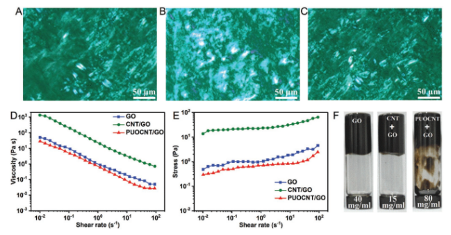 Figure 2. A–C)水性GO,CNT/GO和PUOCNT/GO分散體的偏振光學(xué)顯微鏡圖像。D,E)穩(wěn)定的粘度和應(yīng)力作為剪切速率的函數(shù)。F)GO,CNT / GO和PUOCNT/GO分散體的照片。