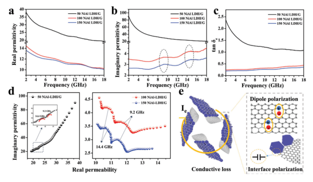 Figure 4. a)實際介電常數(shù)(?'),b)虛數(shù)介電常數(shù)(?''),和c)介電損耗正切(tan ?e)的頻率依賴性。d)NiAl-LDH/G樣品的科爾-科爾曲線。e)NiAl-LDH/G吸收劑中介電損耗機理的示意圖。