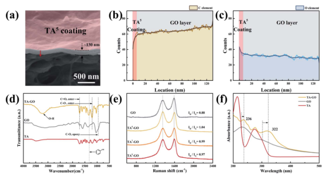 Figure 2.(a)TA5-GO/PTFE膜的橫截面SEM圖像。(b-c)元素分布。(d)TA–GO膜,GO膜和TA粉的FTIR光譜。(e)GO,TA5-GOTA7-GO和TA9-GO膜的拉曼光譜。(f)TA-GO,GO和TA水溶液的紫外-可見光譜。