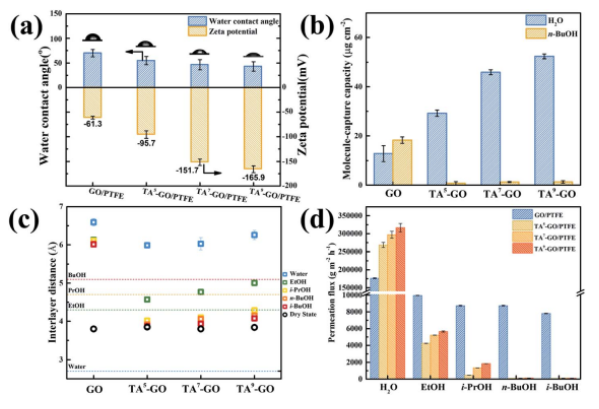 Figure 4.(a)不同膜的水接觸角和表面zeta電位。(b)不同膜的分子捕獲能力。(c)不同膜在不同的溶劑中的層間距。(d)單組分溶劑滲透通量比較。