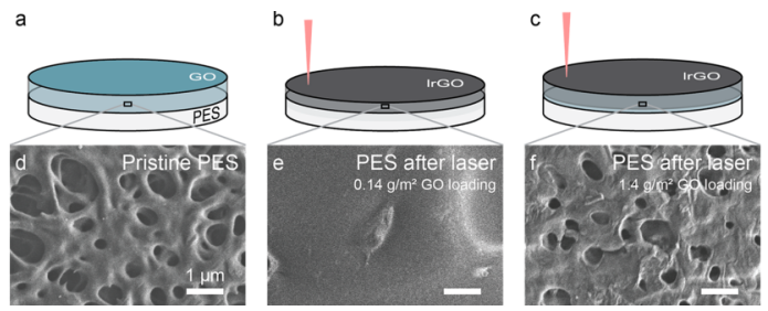 Figure 1.(a)沉積氧化石墨烯(GO)到聚醚砜(PES)膜上的示意圖,(b)GO涂層-PES膜的激光照射,以及(c)最終膜結(jié)構(gòu)的示意圖。(d)47毫米直徑PES膜的照片。(e)PES膜,(f)GO涂層-膜和(g)激光還原GO涂層-膜的SEM圖像。