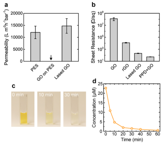 導(dǎo)電膜是一種有前途的減少水處理成本的途徑,因?yàn)樗鼈兡軌蜃畲蟪潭鹊販p少污垢的有害影響,降解污染物,并在過濾過程中提供其他利處。這里,利用激光還原氧化石墨烯(GO),構(gòu)建了一種導(dǎo)電膜,該實(shí)驗(yàn)方法便捷且成本低。首先,將GO過濾到聚醚砜膜載體上,然后通過激光熱解沉積成導(dǎo)電膜。激光還原GO復(fù)合膜可用于滲透水,薄層電阻低至209Ω/□。施加電壓為8V時,激光還原GO膜去除97%以上的水污染物,25μM甲基橙染料。此外,該研究表明,通過加入對苯二胺結(jié)合分子,可以進(jìn)一步減少激光還原GO膜的薄層電阻(54Ω/□)。