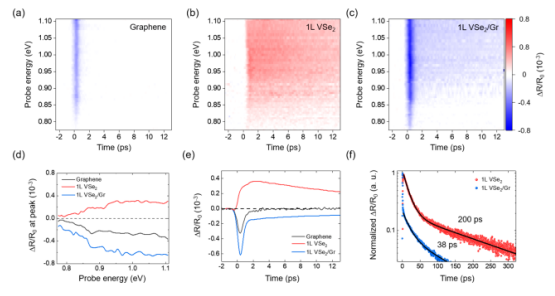 Figure 2. 在不同探針能量下的瞬態(tài)反射率(TR)測量。(a)Gr,(b)1L VSe2和(c)1L VSe2/Gr中的TR二維圖。(d)選定的TR光譜。(e,f)不同時延范圍內(nèi)TR測量的時間分辨軌跡。